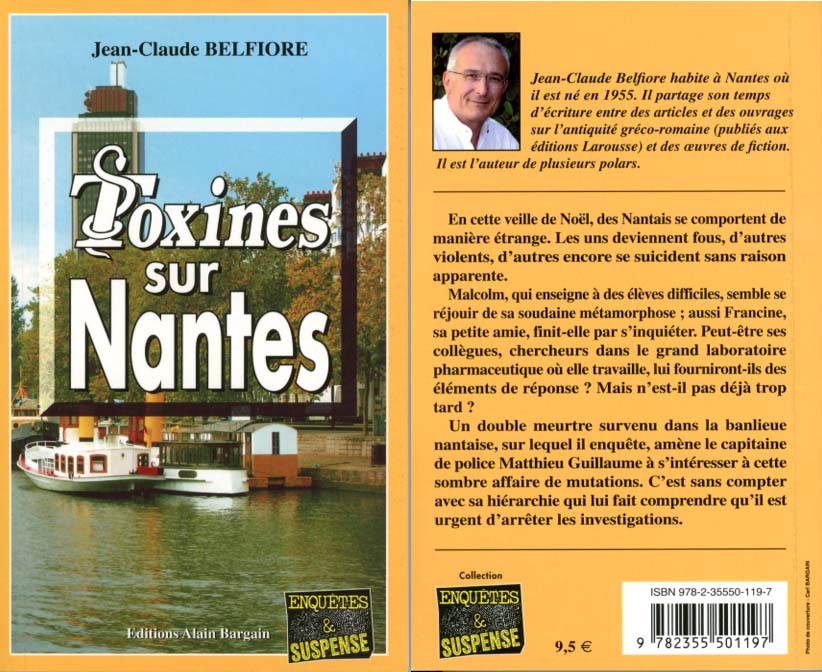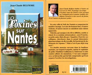 Toxines sur Nantes par Jean-Claude Belfiore. Paru en octobre 2012. En cette veille de Noël, des Nantais se comportent de manière étrange. Les uns deviennent fous, d’autres violents, d’autres encore se suicident sans raison apparente. Malcolm, qui enseigne à des élèves difficiles, n’est pas mécontent de ce qui lui arrive. Il semble même se réjouir de sa soudaine métamorphose. Francine, sa petite amie, finit par s’inquiéter. Peut-être que ses collègues, chercheurs dans le grand laboratoire pharmaceutique où elle travaille, lui fourniront des éléments de réponse ? Mais n’est-il pas déjà trop tard ? Un double meurtre survenu dans la banlieue nantaise, sur lequel il enquête, amène le capitaine de police Matthieu Guillaume à s’intéresser à cette sombre affaire de mutations. C’est sans compter avec sa hiérarchie qui lui fait comprendre qu’il est urgent d’arrêter les investigations. |